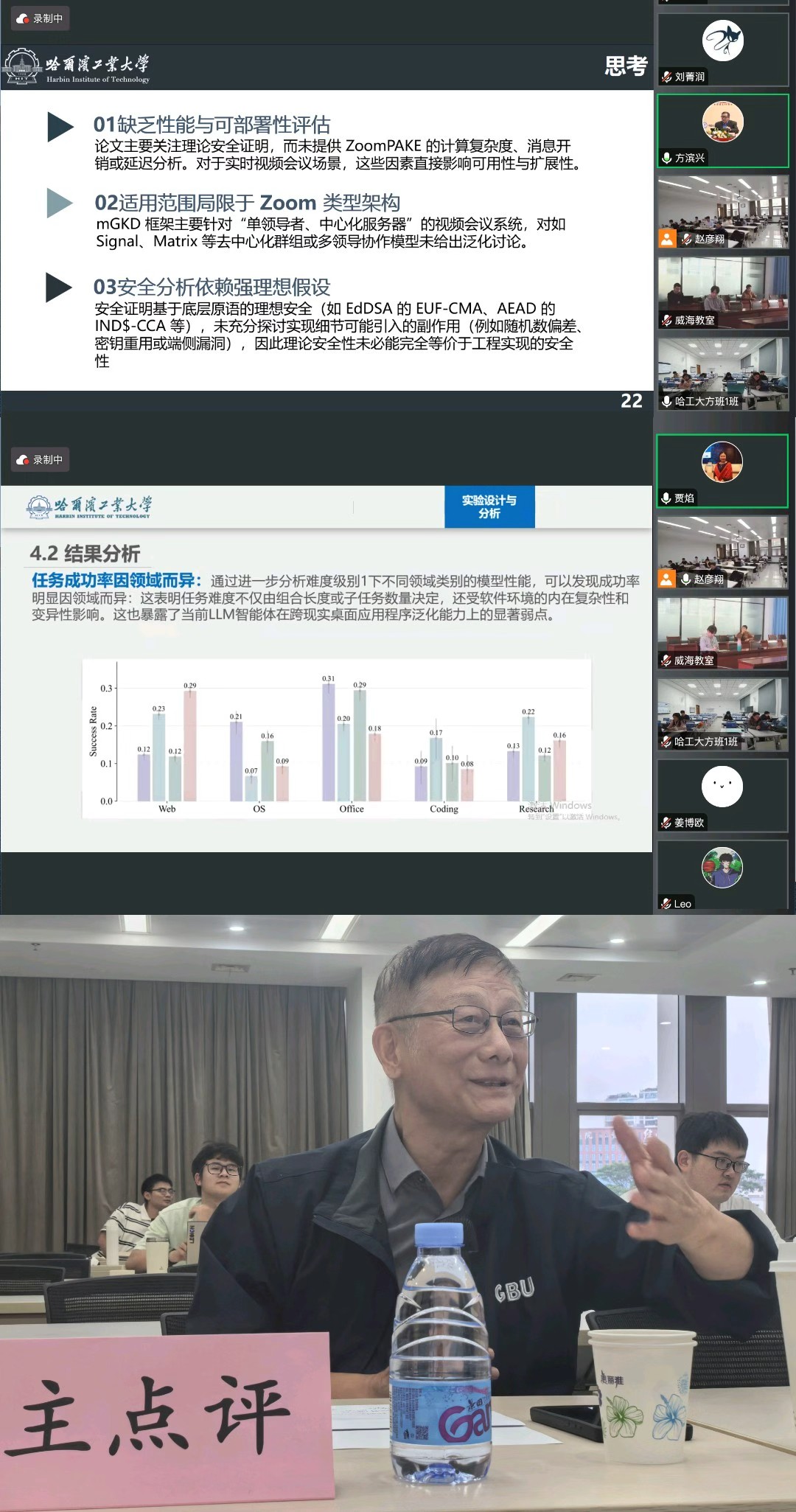 在本次学术汇报中,方院士表示该研究融合了不同安全机制的创新方法,建议未来可对其应用模型中的假设进行更贴近实际场景的优化;贾焰教授强调汇报应首先清晰阐述研究解决的问题背景与实际应用场景,并通过具体实例说明方法如何解决问题,以帮助听众更好地理解研究价值;李晓明教授以人脸识别门禁系统为例,阐述了该技术在现实场景中的可行性,并建议通过真实环境测试来验证其跨模型适应性。