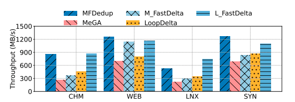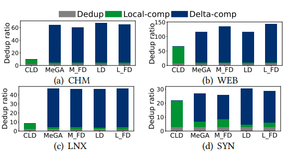 图二、图三分别展示了不同差量压缩框架的备份吞吐和去重压缩率,FastDelta 在保持极高压缩率的同时,将备份速度提升至接近传统分块去重的水平,相比现有差量系统提升约1.3×-2.1×,有效解决了长期以来差量压缩“高压缩比、低吞吐量”的权衡难题。