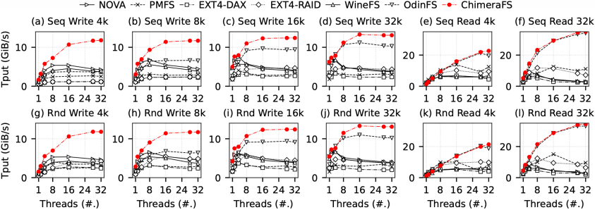 图一展示了不同文件系统在不同I/O大小、I/O模式以及并行度下的性能,实验结果表明ChimeraFS取得了总体最好的性能,在所有负载中,性能都优于另一PM上的数据写入并行化文件系统OdinFS。ChimeraFS在4KiB和32KiB写入中,高并发场景(超过8线程)下分别比其他文件系统性能提升1.99×至10.13×和1.19×到5.77×。该成果已发表于领域顶级会议Proceedings of the Twenty-First European Conference on Computer Systems(EuroSys ’26,CCF-A)。