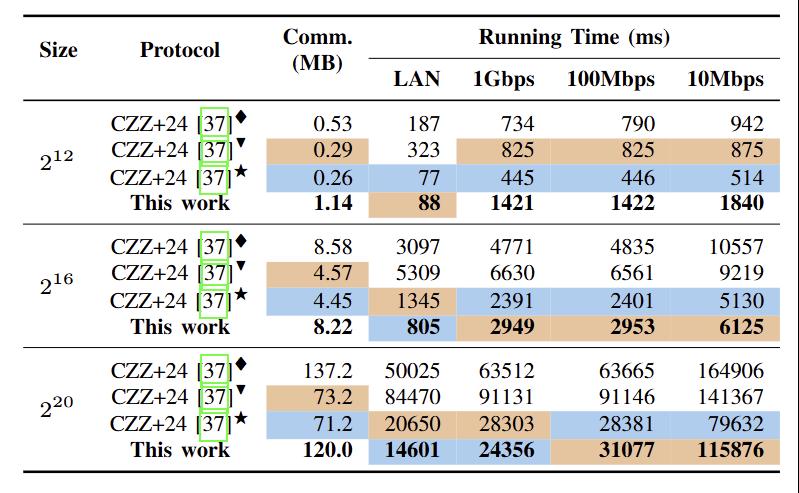 在此基础上,本文引入了安全多方计算中“离线-在线”的计算范式,将与隐私输入无关的计算前置至离线阶段完成,显著降低了在线阶段的计算与通信开销。实验结果如表1所示,本工作协议在性能上与Chen等人(PKC 2024)的PSO方案相当,在局域网环境下实现了1.41–3.43倍的效率提升,在广域网环境下实现了0.91–2.05倍的效率提升。