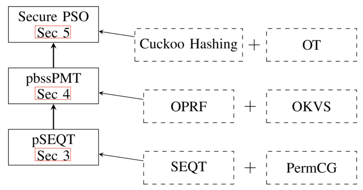 本文系统分析了现有PSO框架中隐私泄露的产生机理,提出了一种无隐私泄露的PSO框架。具体而言,本文识别出已有PSO协议执行过程中存在泄露隐私交集大小的明文消息,进而引入隐私比较协议将其转化为秘密份额,从而有效解决了隐私泄露问题。本文技术框架如图1所示。