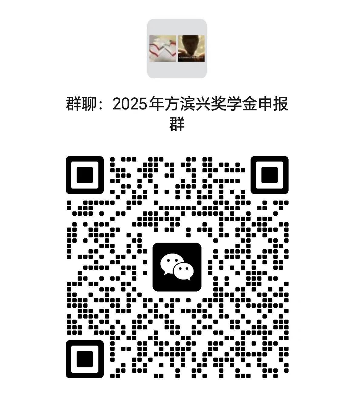 符合条件的相关学生均可申请方滨兴奖学金,“方班”实战突出人才/青年优秀人才/优秀潜力人才分开评选。申请人参照附件1的细则要求,填写附件2《2025年方滨兴奖学金申请表》,并于2025年12月9日(周二)17:00前将签字纸质版(双面打印,一式三份)提交至评审委员会指定地点:信息楼2009,签字扫描电子版(命名为:实战突出人才/青年优秀人才/优秀潜力人才-博士/硕士/本科-学号-姓名-导师姓名-方滨兴奖学金申请表)发送至https://yunbiz.wps.cn/c/collect/cvBrEiQaK97,并扫描以下微信二维码进群。