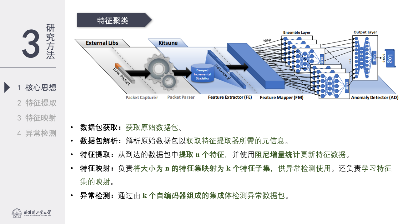 未来研究方向为勒索软件的数据泄露行为检测,其检测内容包含各类网络协议。因此希望所选检测方案检测范围足够广,能够涵盖较多的协议。由于现有且公开的记录双重勒索软件数据泄露行为的流量数据集与流量文件(如PCAP、PCAPNG等)较少,因此需要检测方案对恶意流量数据依赖较小。此外,我们希望检测系统实时性以及内存开销较小,可以部署于计算性能较弱的设备上。基于上述种种原因,选择了Kitsune: An Ensemble of Autoencoders for Online Network Intrusion Detection作为汇报题目。