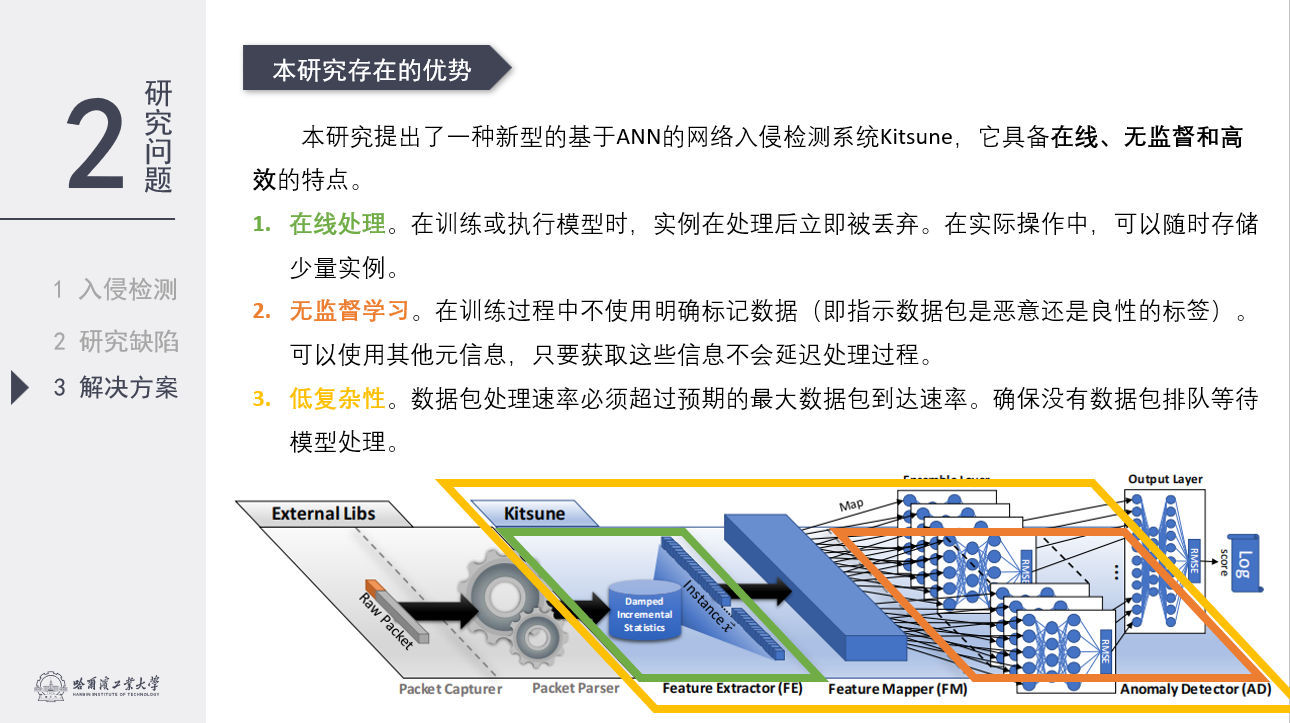 PPT设计存在问题。金老师指出PPT中对于NIDS的背景介绍并不详细,需要对现有NIDS的优缺点以及本文中分布式NIDS的优缺点进行详细介绍。在后文介绍Kitsune优点时进行前后文呼应,回馈前文。以及后续图表中图例颜色的介绍。